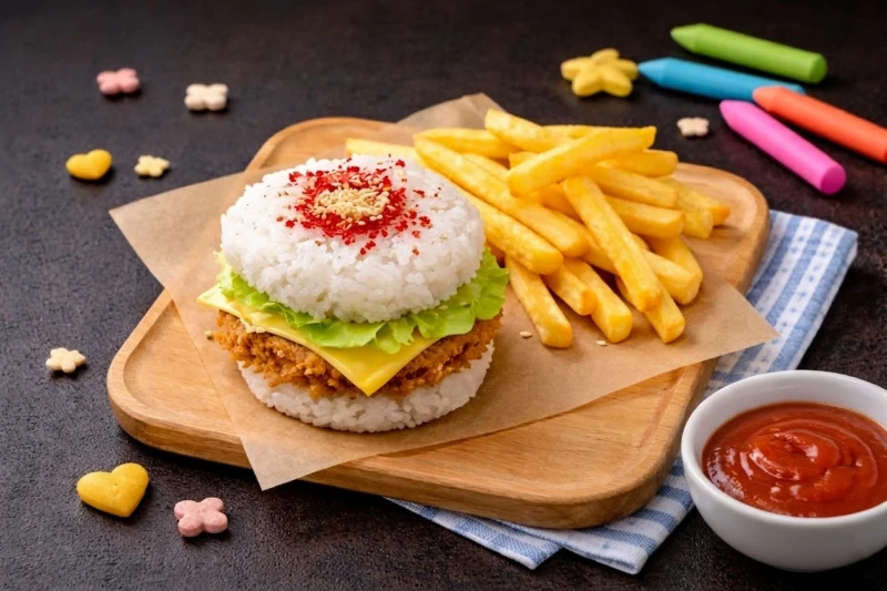 "Котлета из креветки и куриного филе, соленый огурец, авокадо соус, сыр чеддер, салат айсберг, тобико, кунжут. Подается с кариошкой фри и кетчупом."
