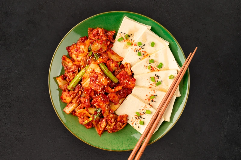 Жареная капуста Кимчи с беконом, зеленым луком, тофу и кунжутом