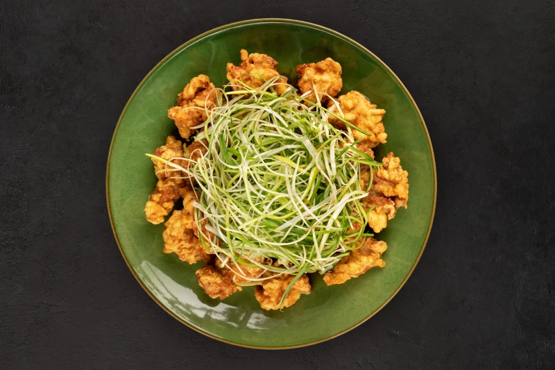 Нежные куриные бедра панировке в пикантном кисло-сладком чесночном соусе с маринованным миксом зеленого и лука порей.