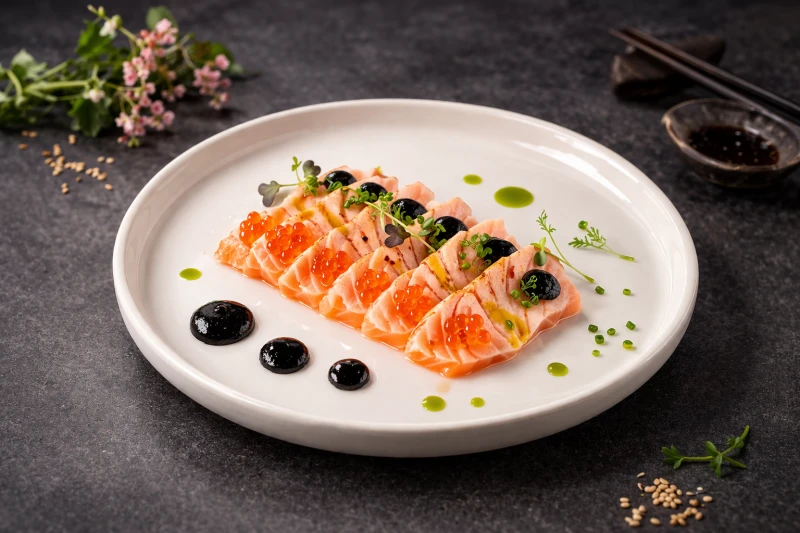 Опаленный лосось c авторским соусом Нери Гама, c красной икрой, подаётся с цитрусовым и зелёным маслами, лимонной цедрой и микрозеленью